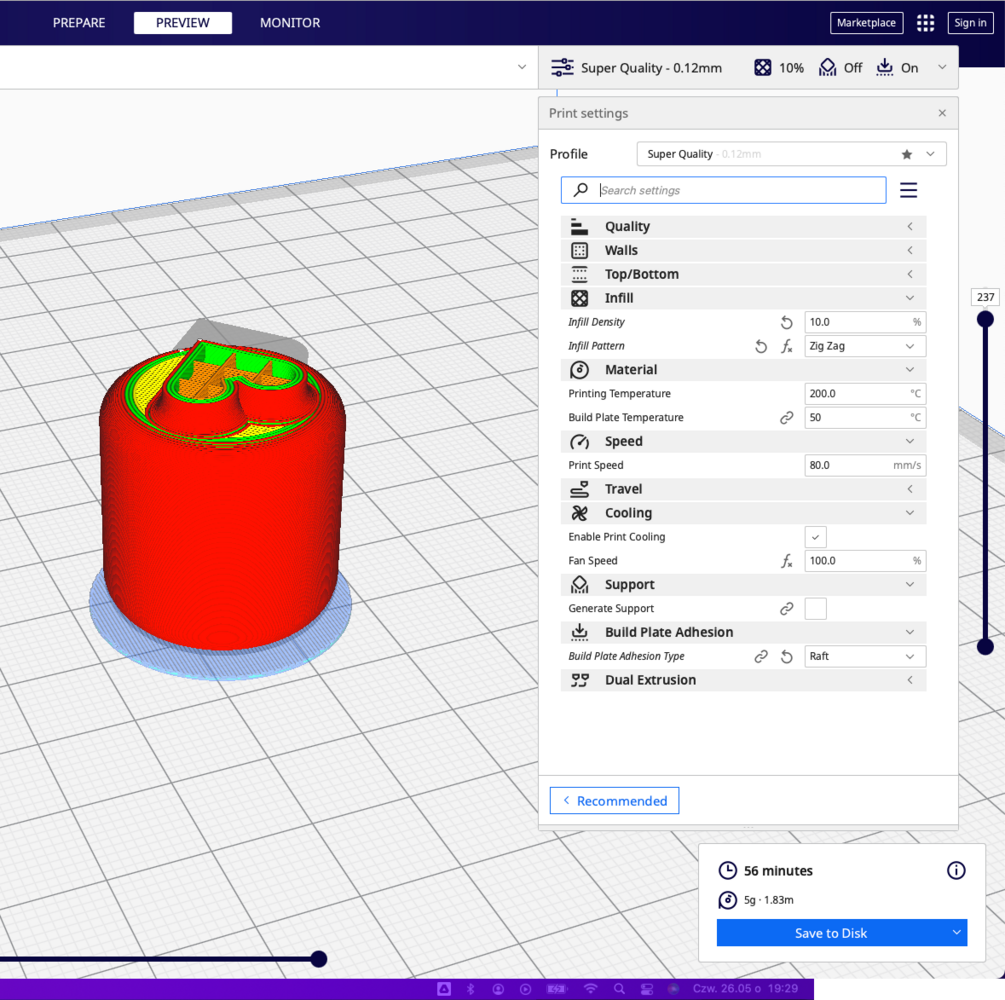 - 10% Infill, Zig Zag - seems to support the heart internally, feels sturdy